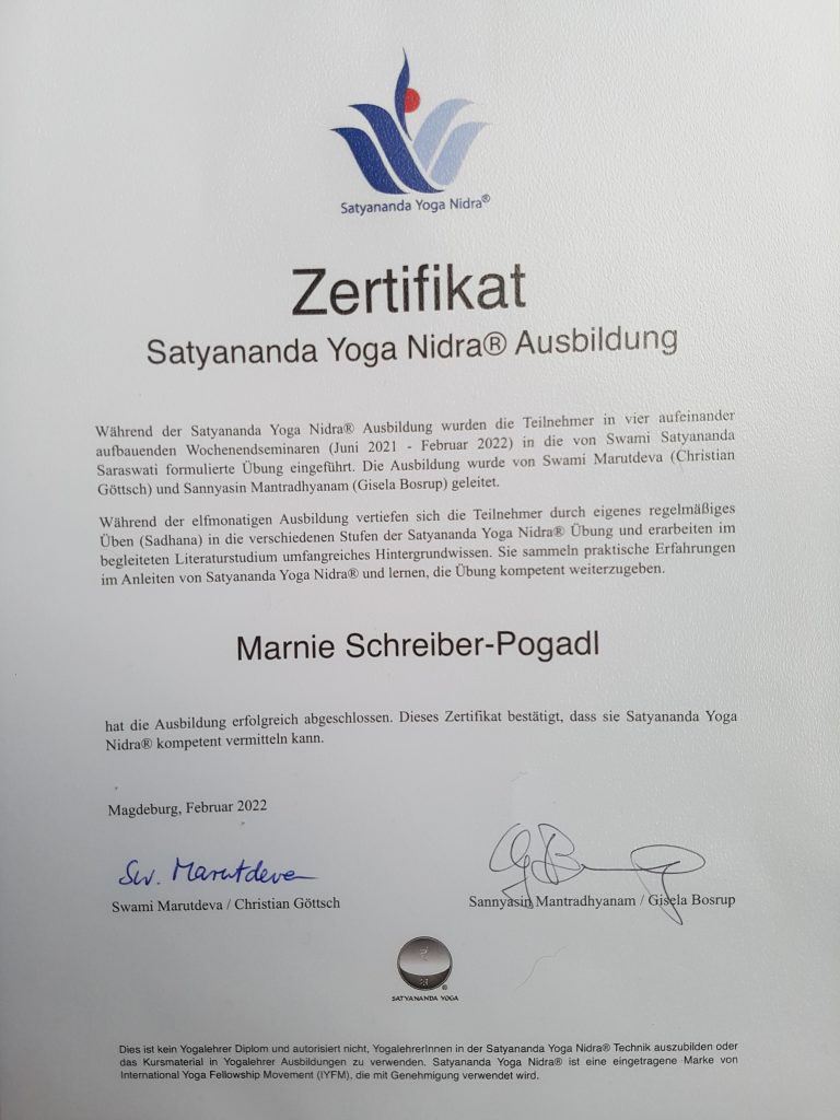 Marnie Schreiber-Pogadl, Kursleiterin/Trainerin Yoga Nidra
